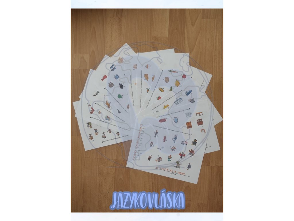 - 10 x A4 s tématy (jobs, animals, food and drinks, house, fantasy world, fruits and vegetables, sports and games, clothes, body, transport)