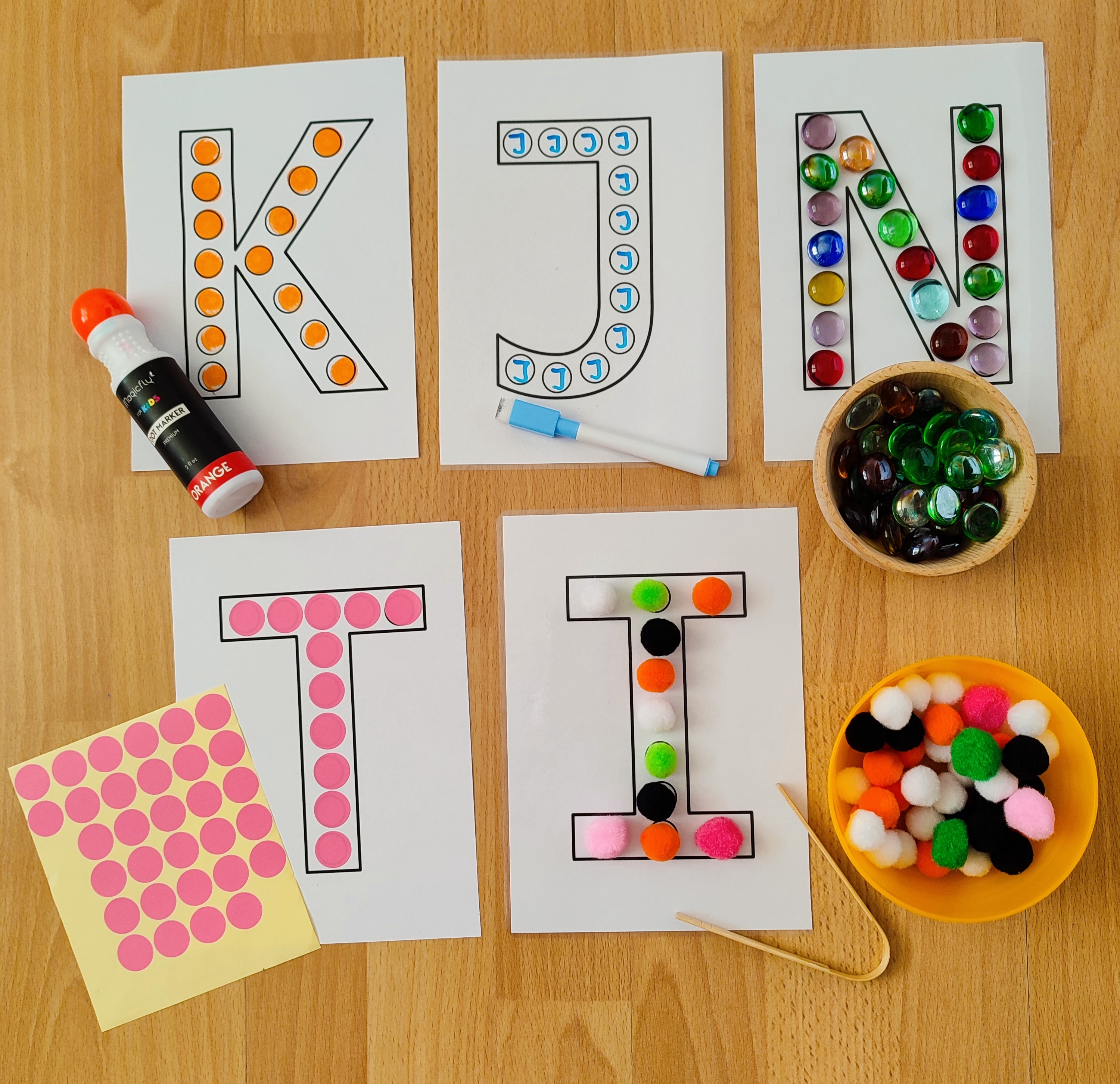 Trénování jemné motoriky přikládáním skleněných oblázků/bambulek, dolepováním koleček, puntíkováním dot markery. Do šablony mohou také dopisovat daná písmena. Šablony koupíte ZDE.