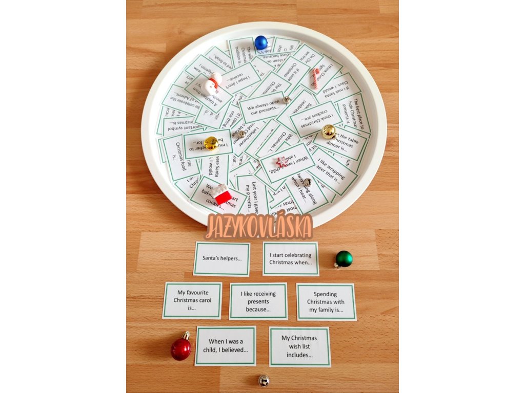 Rádi byste se žáky procvičili mluvení a psaní v angličtině na téma Christmas? Vyzkoušejte 80 kartiček se začátky vět týkajících se Vánoc, které žáci ve dvojicích/malých skupinkách ústně či písemně dokončují a prodiskutují.