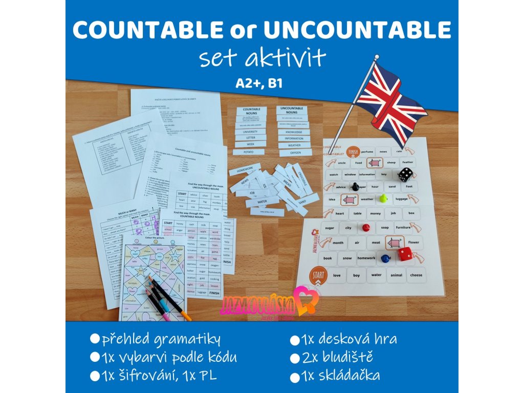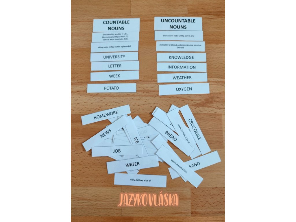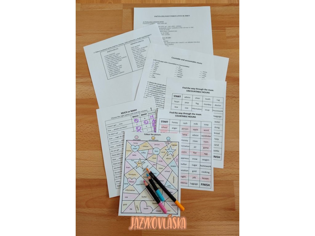 Procvičte se žáky anglickou gramatiku hrou! Počitatelnost podstatných jmen může znít jako nudné téma - žák se při vyplňování učebnice rozhodne, zda je homework počitatelné, zapíše a je konec. Připravte žákům procvičení pomocí skládačky, deskové hry, šifrování, bludišť a vybarvování podle kódu. Soubor samozřejmě obsahuje také přehled gramatiky i pracovní list se cvičeními, i vyplňovací dril je potřeba. Pojďme ale udělat procvičování jako hravou výzvu! Soubor je vhodný pro pokročilejší žáky (A2+ a B1), kromě všech základních nepočitatelných podstatných jmen si procvičí také accommodation, baggage, knowlede, traffic, furniture, lightning, china, weather atd. a také se seznámí s faktem, že některá podstatná jména mohou být počitatelná i nepočitatelná (room, hair, experience, coffee, iron, chicken, paper...).