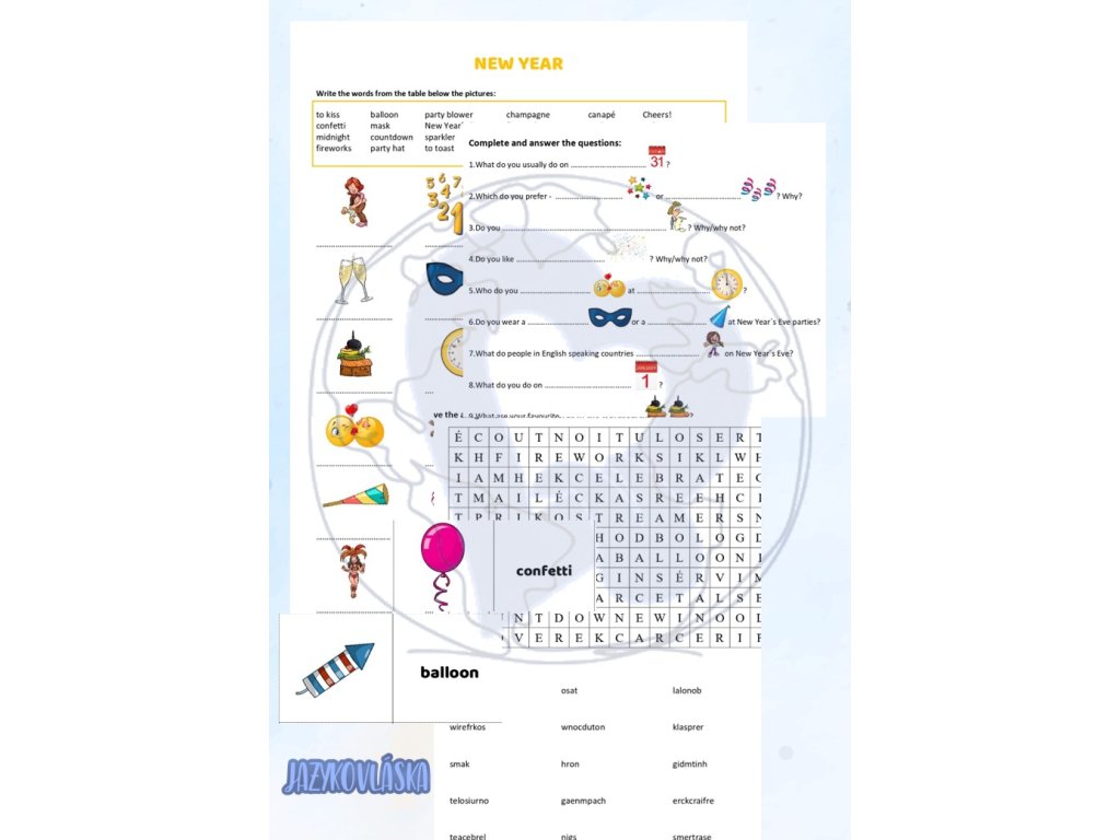 Použitá slovíčka: canapé, sparkler, fireworks, fireckracker, mask, party hat, horn, party blower, to make New Year´s resolution, to sing, to kiss, to dance, to celebrate, confetti, streamers, champagne, Cheers!, to toast, countdown, New Year´s Eve, New Year´s Day, balloon, midnight, to hug.