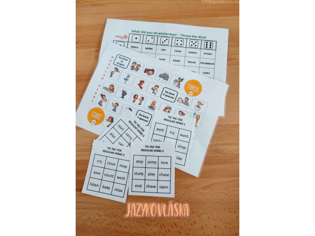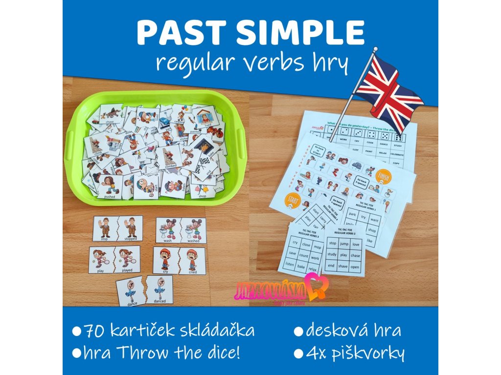 Hledáte aktivity na procvičení pravidelných sloves v minulém čase prostém? Mám pro vás 4 zábavné hry na opakování a upevňování tvorby minulého času v angličtině. Žáci si mohou zahrát piškvorky (řeknou správný tvar v minulém čase a označí si políčko, výhercem se stává hráč, který jako první spojí tři pole), obrázkovou deskovou hru (žáci se střídají v hodu kostkou a musí pojmenovat obrázek a utvořit minulý čas), deskovou hru Throw the dice! (žáci použijí dvě kostky, podle hozené hodnoty utvoří ze slovesa na daném políčku minulý čas, šikovnější mohou utvořit celou větu. Pokud čas utvořili správně, označí si pole fixou či žetonem. Vyhrává ten, kdo má na konci hry nejvíce označených políček) a ve skládačce přiřadit k obrázku se slovesem v přítomném čase druhou část s obrázkem se slovesem v past simple (více aktivit najdete popsaných v návodu).