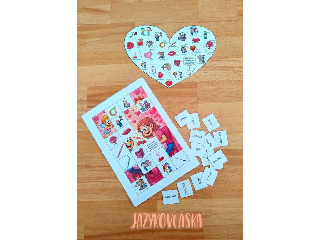 - skládání slovíček z polovin srdcí (celkem 30 slovíček), můžete si vybrat z černobílé či růžové varianty,