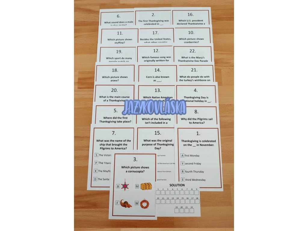 Probíráte se žáky anglické svátky? Přečetli jste společně informace od Dni díkůvzdání? Přemýšlíte, jak ověřit znalosti, které si osvojili o Thanksgiving Day? Vyzkoušejte procvičování angličtiny v pohybu, které žáky zaktivizuje. Na žáky čeká 22 otázek, které musí správně zodpovědět, aby získali tajenku - otázku, kterou pak využijete ke konverzaci.