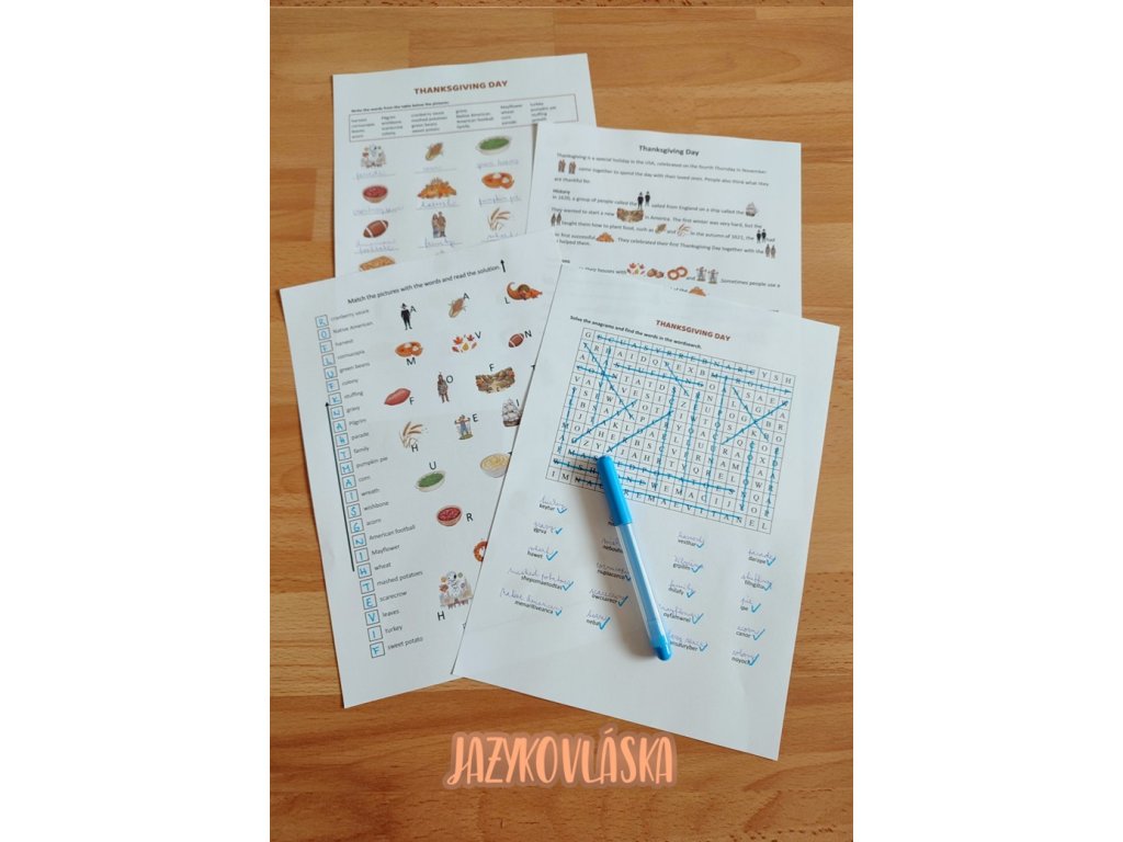 - 4 pracovní listy na téma Thanksgiving Day (přehled slovní zásoby s přiřazováním, osmisměrka s anagramy, obrázkové čtení, přiřazován s tajenkou).
